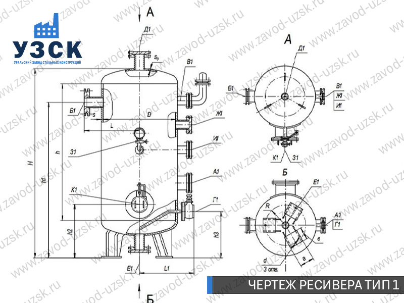 Ресивер воздуха (воздухосборник, воздушный ресивер) | 0,5 — 200 м3 | До 6,3 МПа | горизонтальный ресивер / вертикальный ресивер | Ст3, Ст20, 16ГС, 09Г2С, 10Г2С1, 12Х18Н10Т, 08Х18Н10Т (или аналоги) | накопление сжатого воздуха, вырабатываемого компрессорами | В-0,5 В-1 В-1,6 В-2 В-3,2 В-4 В-6,3 В-8 В-10 В-16 В-20 В-25 В-32 В-40 В-50 В-60 В-80 В-100 В-200 |